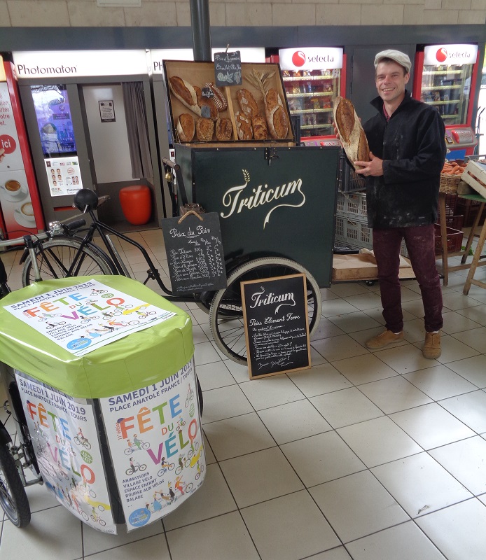 Chaque vendredi après-midi de 15h30 à 19h00, Thibaud FERARD, distribue son pain en gare de Tours, accompagné de son triporteur.