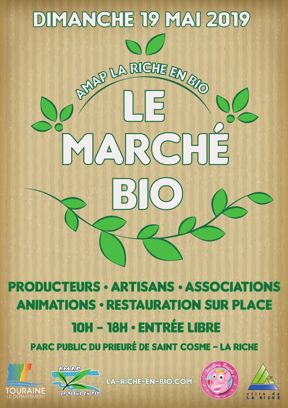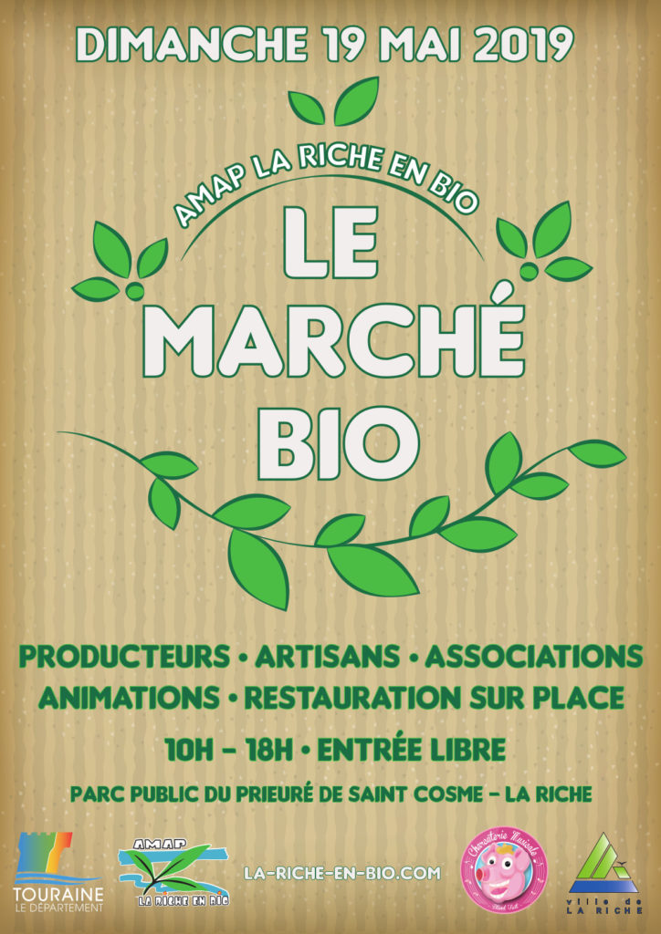 L’AMAP La Riche en bio fête ses 10 ans et organise son traditionnel marché bio le dimanche 19 mai 2019 (10h00-18h00) dans le parc à côté du Prieuré Saint-Cosme à La Riche.